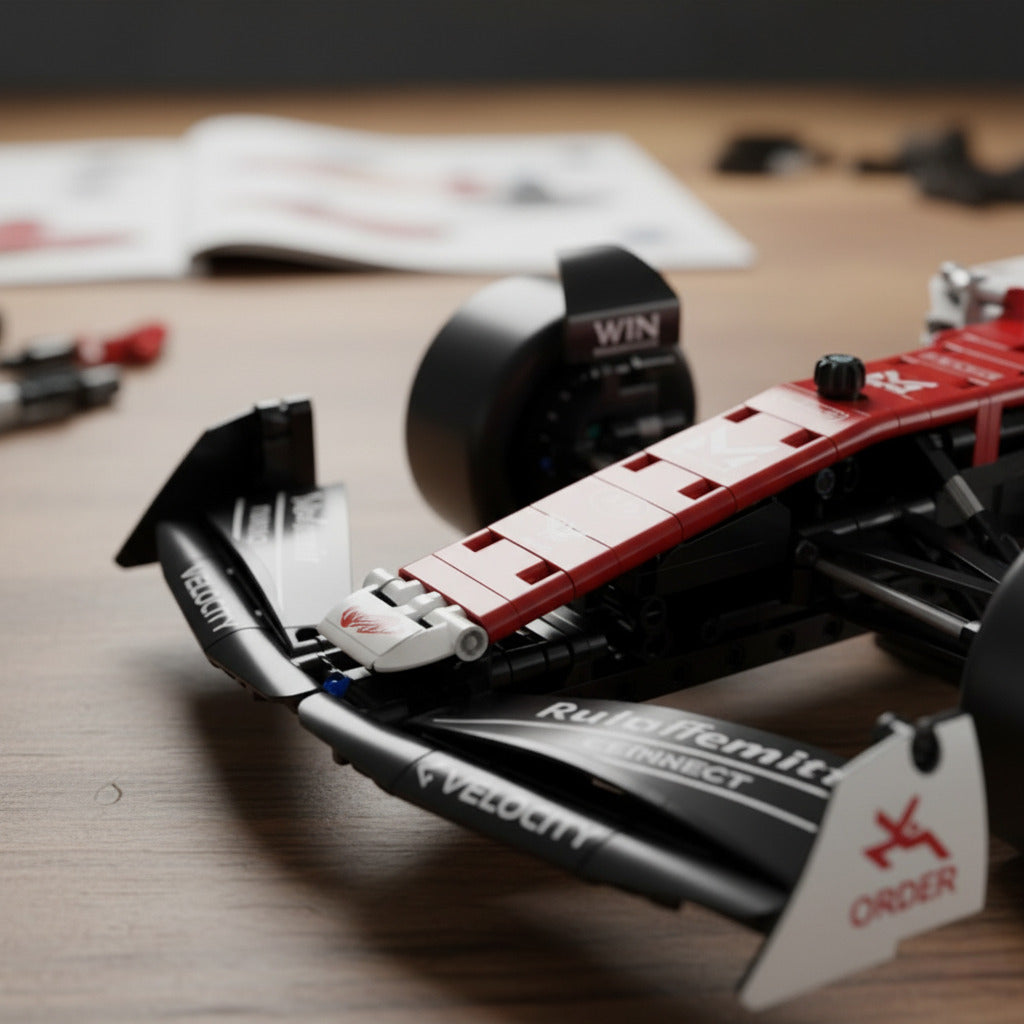 Engenharia Detalhada: Motor V6 híbrido com pistões móveis, suspensão funcional e cockpit detalhado para uma experiência de montagem imersiva.