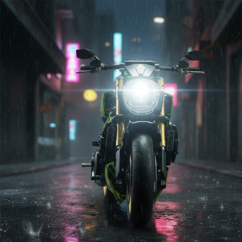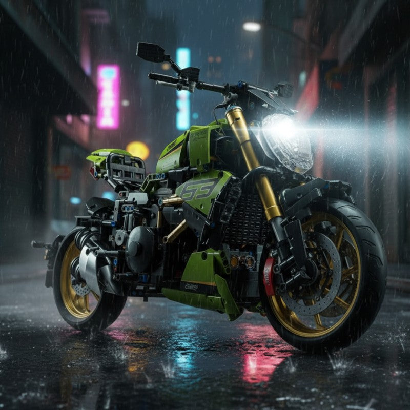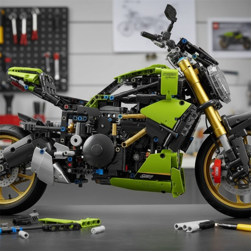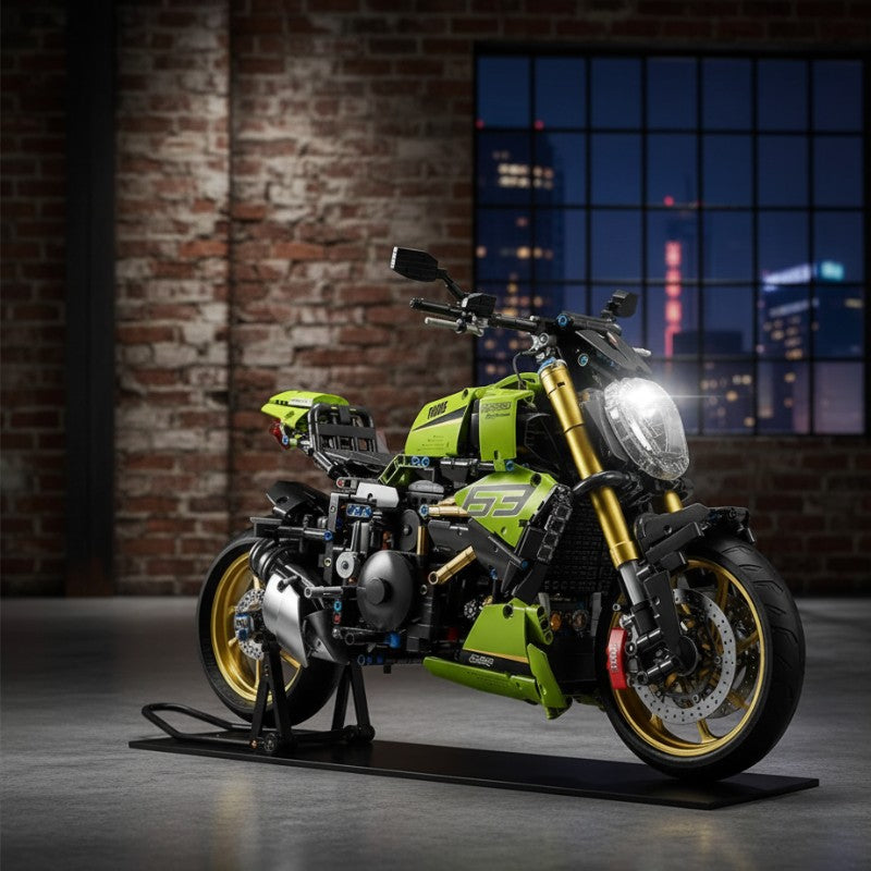 Domine o asfalto com a atitude de uma verdadeira streetfighter. Esta recriação de aproximadamente 2.025 peças celebra a cultura das motos "naked" de alta performance, onde a mecânica fica exposta e o design é minimalista e agressivo. Um modelo para quem ama a beleza bruta da engenharia.