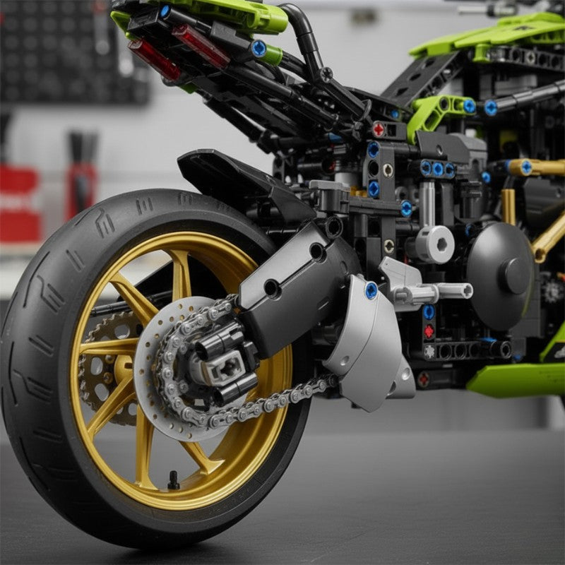 Com aproximadamente 2.025 peças, esta construção é uma celebração da engenharia exposta. Desfrute da montagem do chassi treliçado, do motor detalhado e de todos os componentes que ficam à mostra, em um processo que revela a beleza bruta de uma streetfighter.